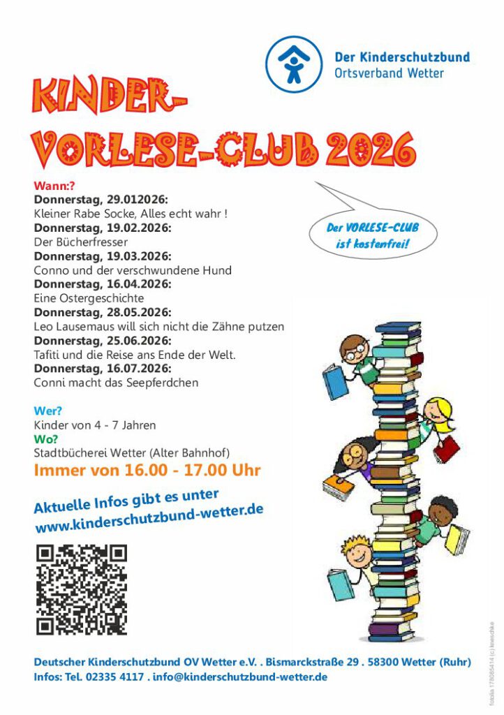 Der Kinder-Vorlese-Club des Kinderschutzbundes Wetter findet in der Stadtbücherei (Alter Bahnhof) Wetter, Bahnhofstr. 17, statt.